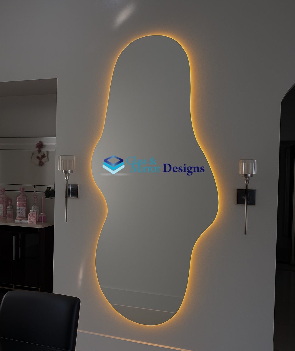 A modern asymmetric wall mirror crafted from 1/4″ polished glass. Its clean, irregular design adds a contemporary touch to any interior space. Available in multiple heights with optional installation.